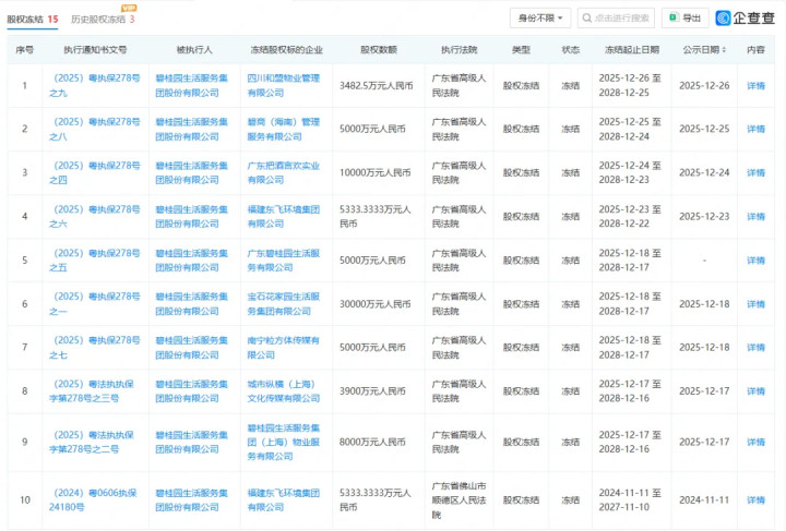 碧桂园生活服务集团深陷“债务泥潭”: 5.23亿元执行案件“缠身”, 旗下10余家公司成被执行人, 9.67亿元股权遭冻结