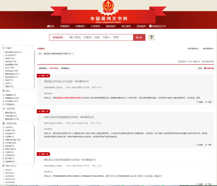 此外,碧桂园生活服务集团近年来官司“缠身”,涉及多起司法案件,且以民事案件为主。中国裁判文书网显示,截至2026年1月26日,碧桂园生活服务集团有23882篇文书,案由包括物业服务合同纠纷、服务合同纠纷、财产损害赔偿纠纷、健康权纠纷、其他民事等。