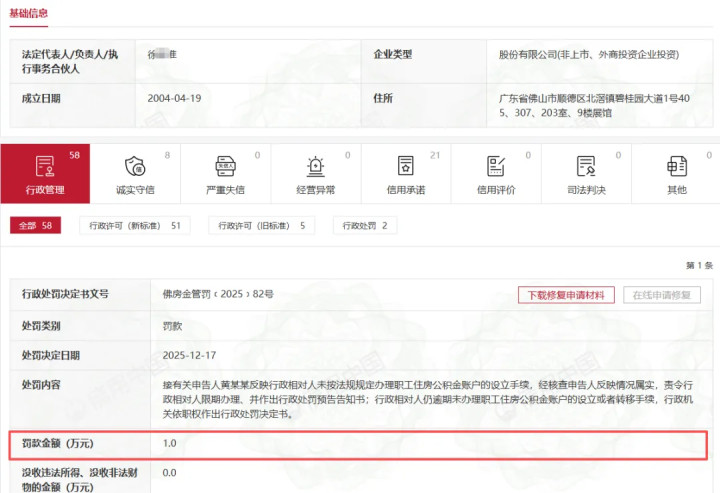 信用中国显示,2025年12月17日,佛山市住房公积金管理中心发布《行政处罚决定书》显示,碧桂园生活服务集团未按法规规定办理职工黄某某住房公积金账户的设立手续,其行为违反《住房公积金管理条例》第十五条规定,并处罚金1万元。
